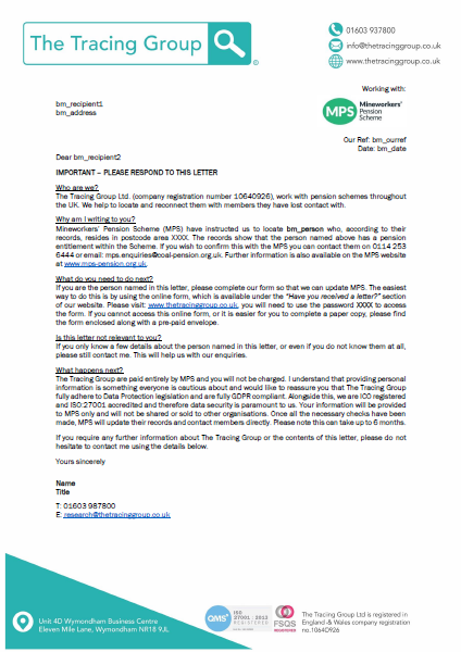 Please be advised that the Mineworkers' Pension Scheme (MPS) has appointed The Tracing Group to help locate pension scheme members living overseas with whom we have lost touch.